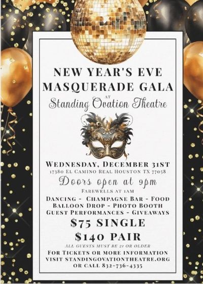 Step into an evening of elegance, enchantment, and celebration as Standing Ovation Theatre proudly hosts its New Year’s Eve Masquerade Gala. This dazzling night promises the perfect blend of sophistication and festivity as we ring in the new year together.